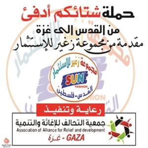 واصلة جمعية التحالف للإغاثة والتنمية ولليوم الثالث على التوالي مواصلة حملة شتائكم أدفأ من القدس إلى غزة، بدعم من مؤسسة مجموعة زغير للإستثمار . بإشراف وتوجيه من الأستاذ / نهاد المغاري